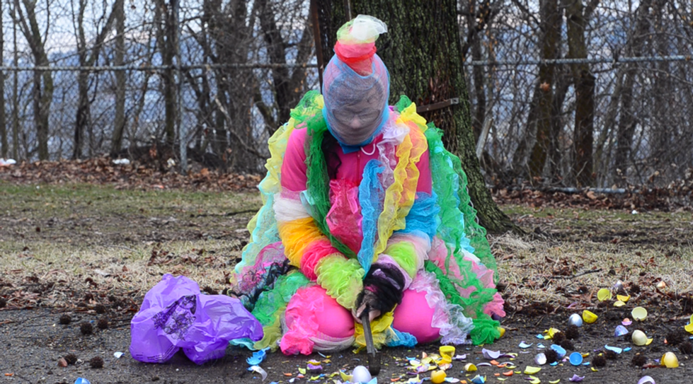 plastic loofahs, crowbar, plastic Easter eggs, bird netting, Easter-themed plastic bag from grocery store
